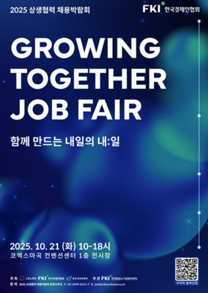 한국경제인협회(한경협)는 고용노동부, 동반성장위원회와 공동으로 오는 10월 21일 서울 강서구 코엑스 마곡에서 2025 상생협력 채용박람회(Growing Together Job Fair)를 개최합니다. 또한 사람인 채용포털을 통한 온라인 채용관을 10월부터 3개월간 운영해 시간과 장소 제약 없이 구직자들이 채용 정보를 접할 수 있도록 지원합니다.