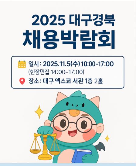 2025년 11월 5일(수), 대구 엑스코 서관 1층 2홀에서 2025 대구·경북 채용박람회가 열립니다. 오전 10시부터 오후 5시까지 진행되며, 현장 면접은 오후 2시부터 5시까지 별도로 운영됩니다. 또한 구직자들이 시간과 장소의 제약을 받지 않도록 10월 20일(월)부터 11월 28일(금)까지 온라인 채용박람회도 병행됩니다. 이번 행사는 고용노동부, 대구광역시, 경상북도, 대구·경북지방중소벤처기업청, 대구지방보훈청, iM뱅크, (사)대구·경북첨단·벤처기업연합회 등 다양한 기관이 주최하며, 대구고용노동청과 ㈜지에스씨넷, 대구·경북대학일자리+센터가 주관해 안정적이고 체계적인 운영을 준비하고 있습니다.