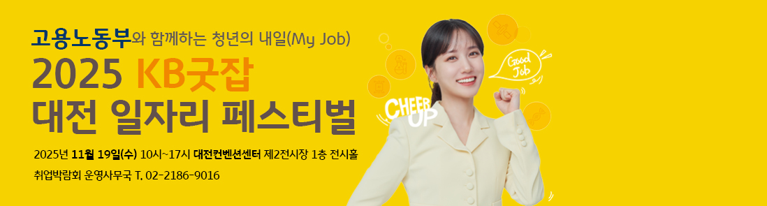 ‘2025 KB굿잡 대전 일자리 페스티벌’은 단순히 채용의 장이 아니라, 구직자와 기업 모두가 ‘함께 성장할 파트너’를 만나는 자리로 기획되었습니다.200여 개의 우수기업과 취업을 희망하는 국민 모두가 자신의 가능성을 확인하고, 새로운 커리어의 첫걸음을 내딛을 수 있는 뜻깊은 행사가 될 것입니다.11월 19일, 대전컨벤션센터에서 한 단계 성장한 나 자신을 만나는 시간을 놓치지 마세요.현장에서, 그리고 온라인으로 이어지는 기회의 장이 여러분을 기다립니다.